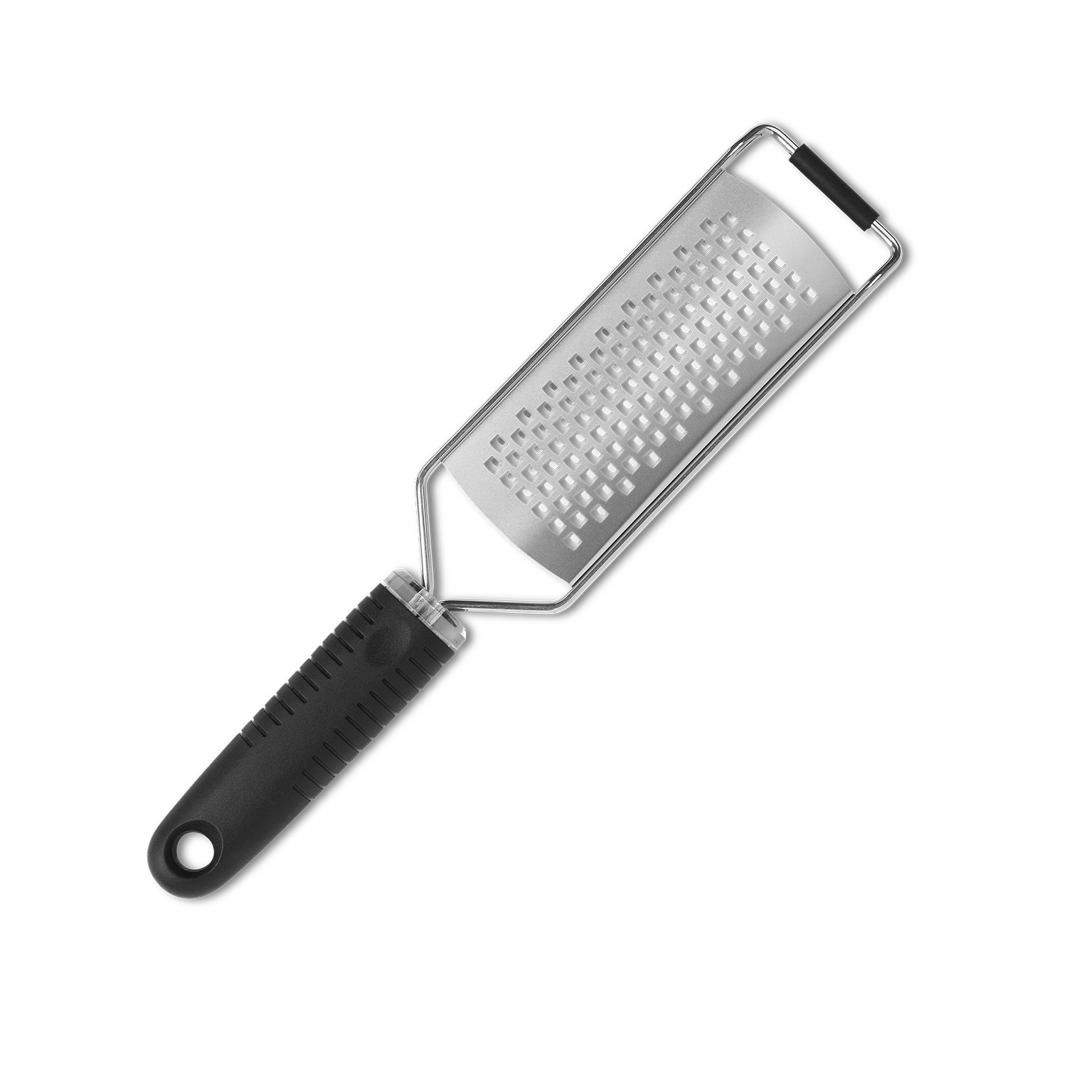 The greater, grater! Our durable Course Cheese Grater is perfect for shredding cheese, veggies, and more! Made of stainless steel with a rubber non-slip grip handle for comfort, this space-saving grater is a kitchen must-have. It also comes with a plastic protector to keep the blades and your fingers protected between uses.