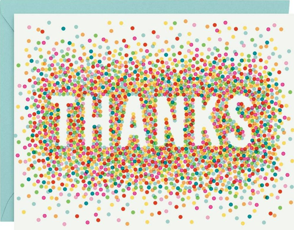 A colorful and fun way to express your gratitude! This thank you card set features an explosion of rainbow confetti with “THANKS” boldly written in white. Send in the mail or pair with a lovely gift of thanks. Blank inside. Paired with a Pool envelope. Design by Paper Source.