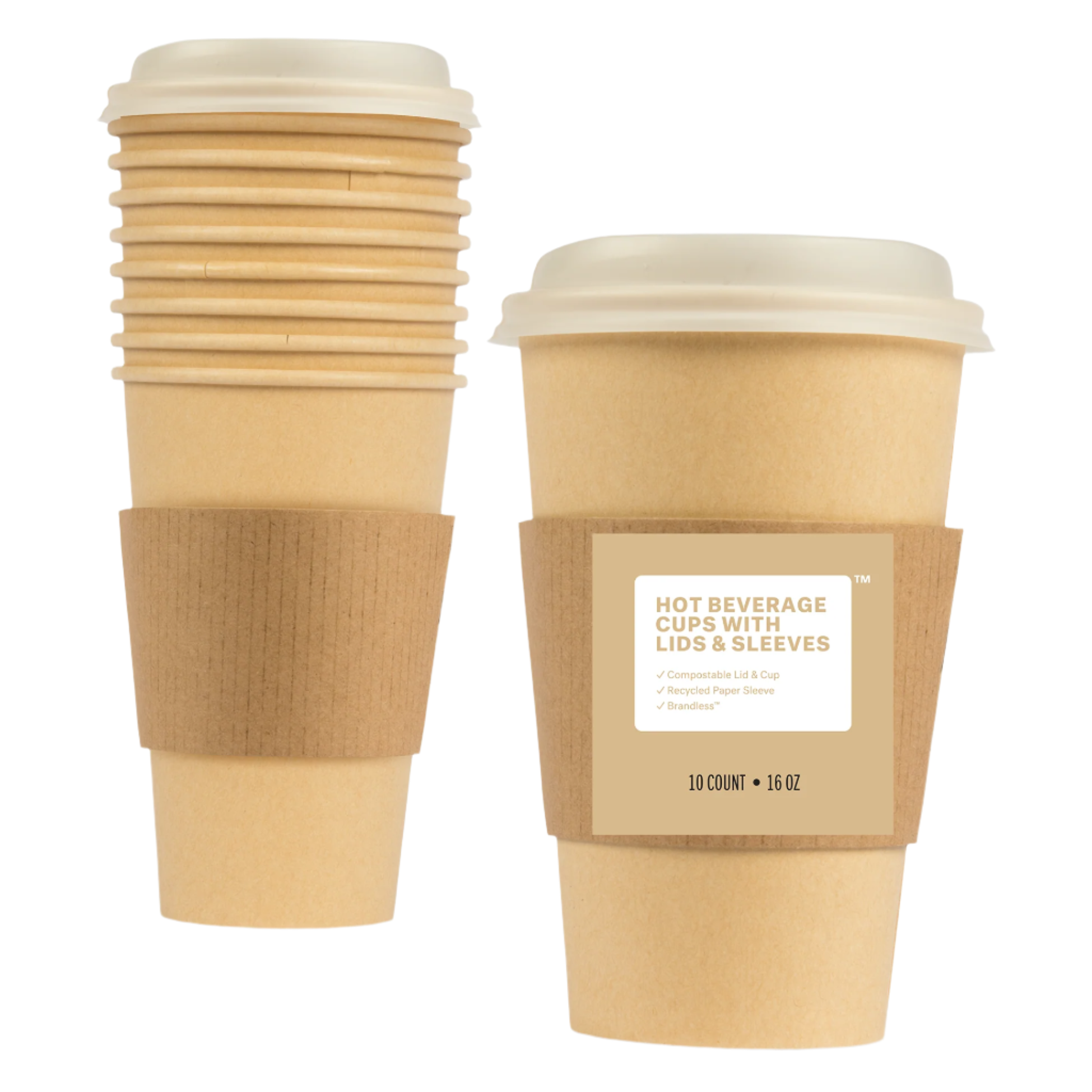 Made with compostable plastic, our handy 16 oz disposable cups & lids are perfect for your next on-the-go outing. They have the same strength and versatility as regular disposable cups, so go ahead & fill one with your favorite hot beverage, then slide on its recycled cardboard sleeve. Did someone say coffee hour? Each pack contains 10 cups, lids & sleeves.