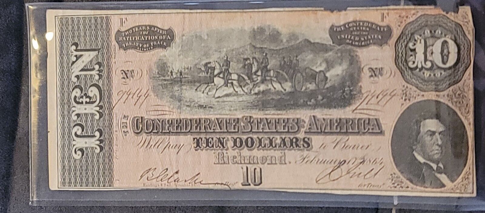 This is a Confederate States $10 bank note from February 17, 1864. It features intricate designs and markings, with the denomination clearly marked as $10. The note has been circulated but remains in excellent condition for its age. It is a great addition to any collection of Confederate currency or historical artifacts. The bank note is ungraded and uncertified, but its authenticity is guaranteed. Don’t miss out on the opportunity to own a piece of American history.