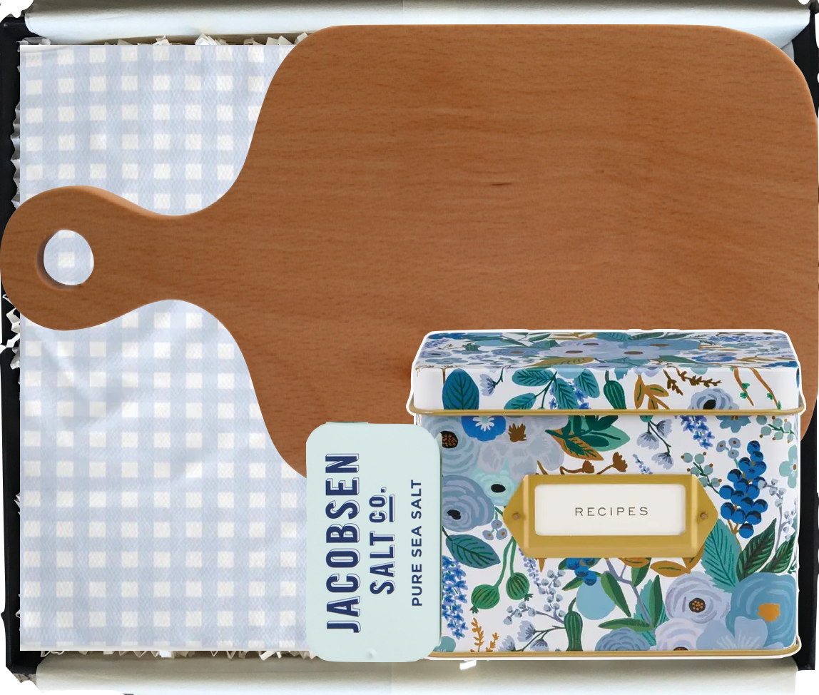 A tasteful gift for the heart of the home! This is perfect for those who love to entertain and create new memories in the kitchen. MINI CHARCUTERIE BOARD RIFLE PAPER // RECIPE TIN GEOMETRY // TEA TOWEL JACOBSEN SALT CO. // KOSHER SEA SALT SLIDE TIN