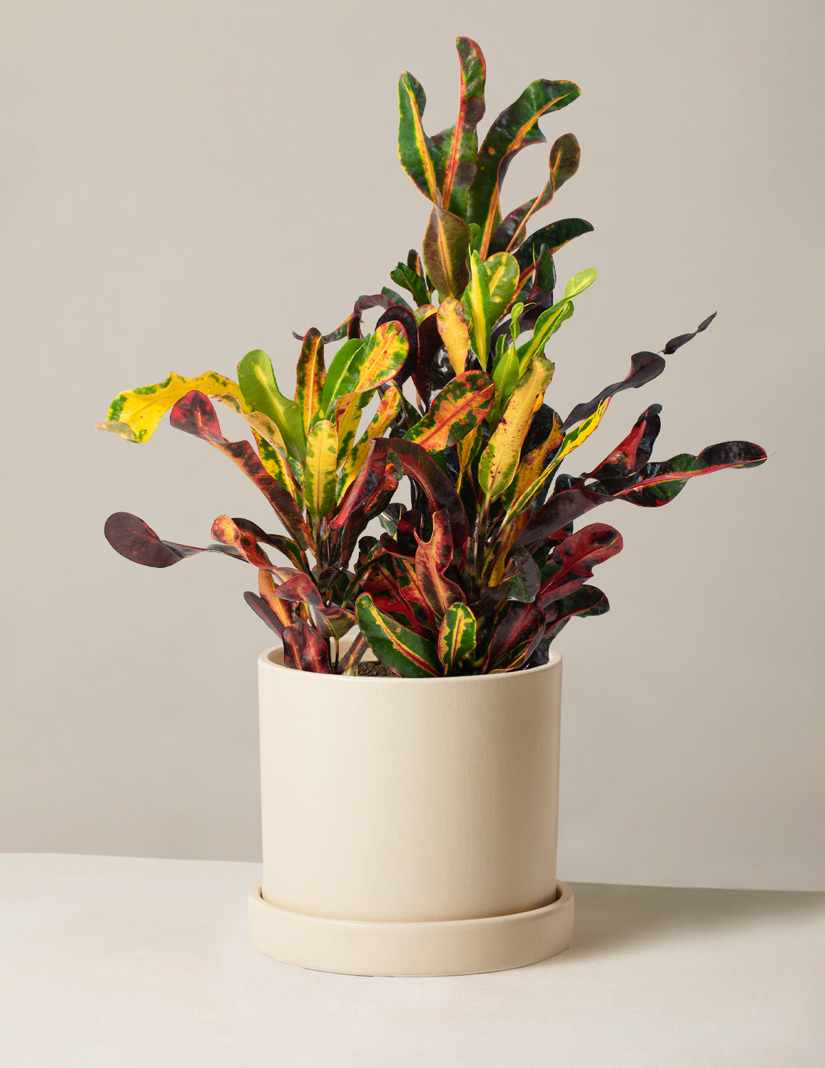 This variegated croton gets its name from its thin, twisty leaves, which are dappled in shades of red, yellow, green, and pink. The more light it gets, the brighter and more varied the colors become. To that point, this tropical plant requires bright direct sun. South- and west-facing windows are best.