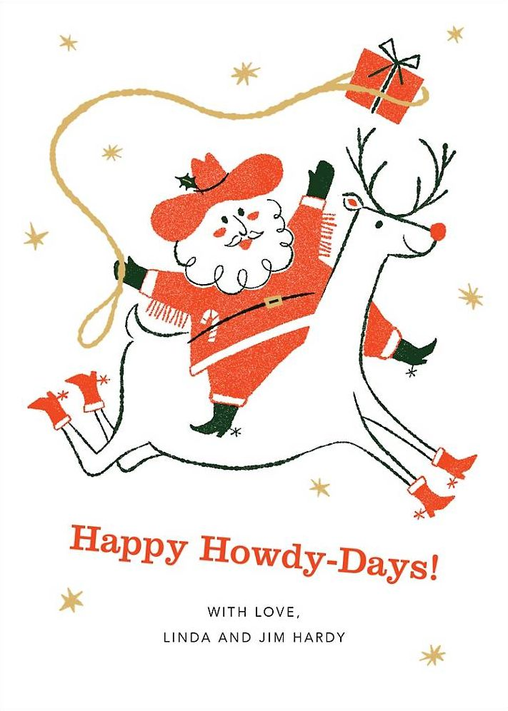Yeehaw! Santa’s gone wild west, and he’s ropin’ in the holiday fun. Printed on Mohawk 120.0 lb Superfine Ultra White. This paper is FSC certified, with 30% post consumer recycled content, and made using wind power. Looking for something speedier than snail mail? You can send this design digitally with our partners at Paperless Post.