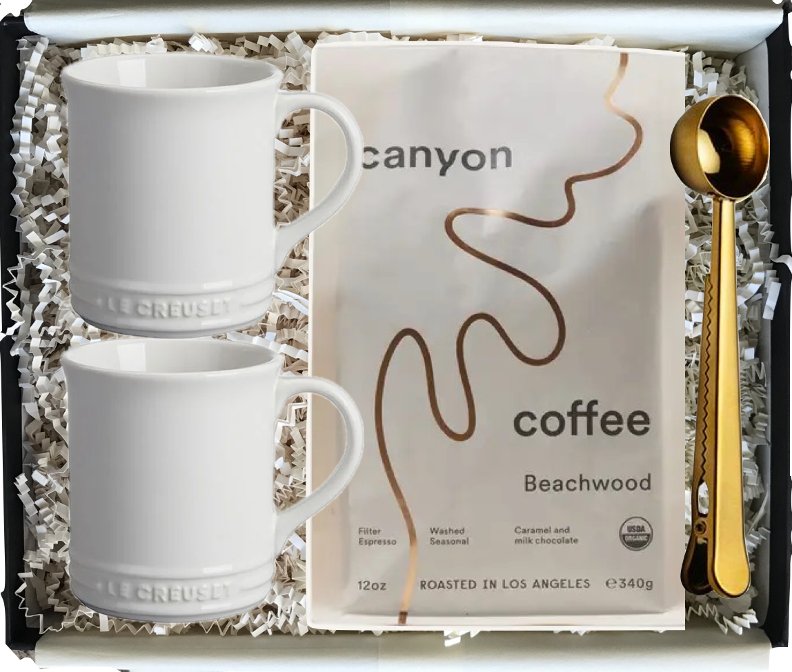 A warm hug in a box! Perfectly packaged for coffee lovers, this gift is sure to bring joy to your loved one with every sip. LE CREUSET // VANCOUVER MUG (2) CANYON COFFEE // BEECHWOOD BOXFOX // GOLD COFFEE SCOOP WITH CLIP