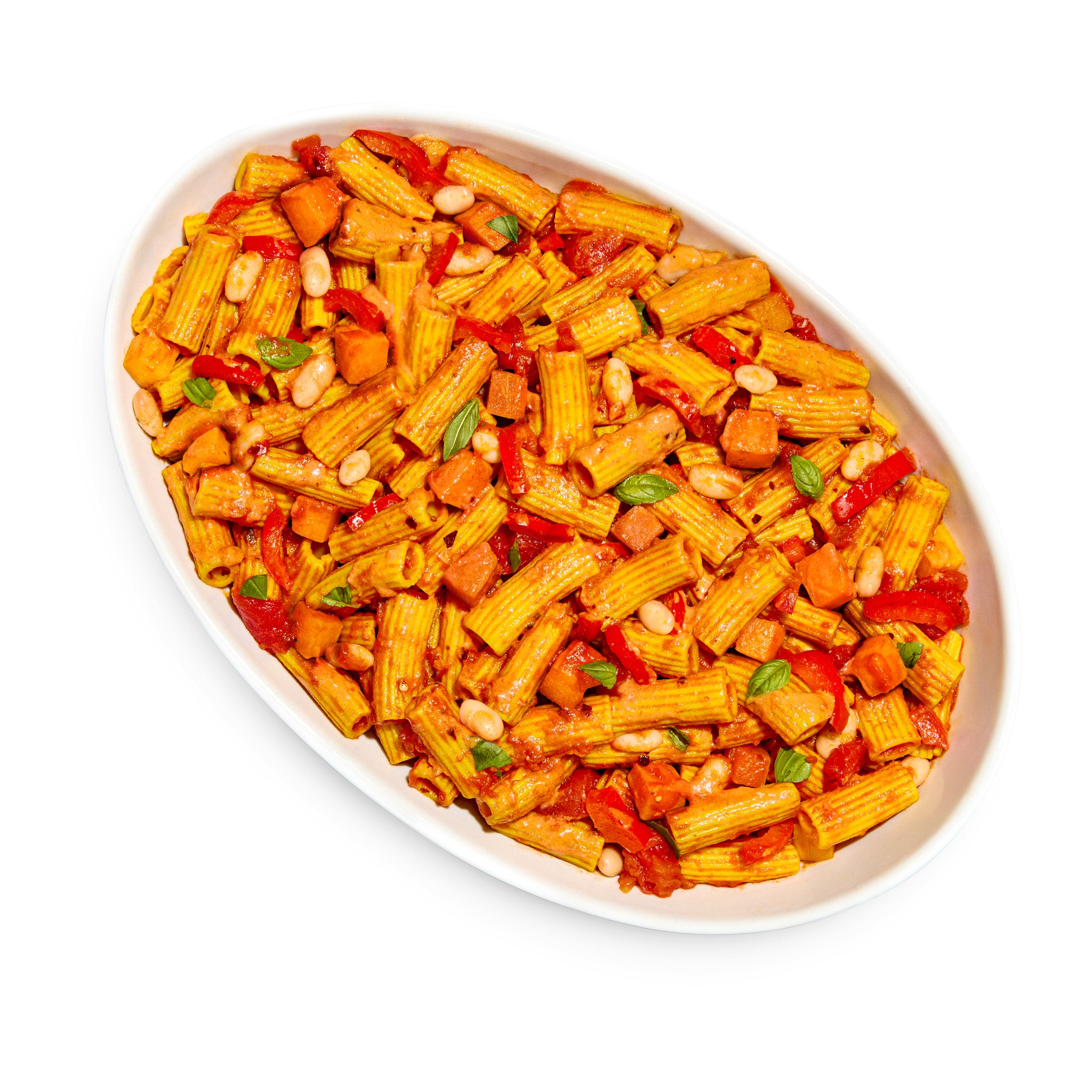 A pasta that tastes creamy and feels light. Gluten-free sedani pasta tossed in a tomato sauce made creamy with butternut squash, sweet potato, parsnip, and savory nutritional yeast. Great Northern beans and red bell peppers bring flavor and fiber. Dashes of fresh-squeezed lemon, crushed red pepper, and Himalayan pink salt balance and brighten.