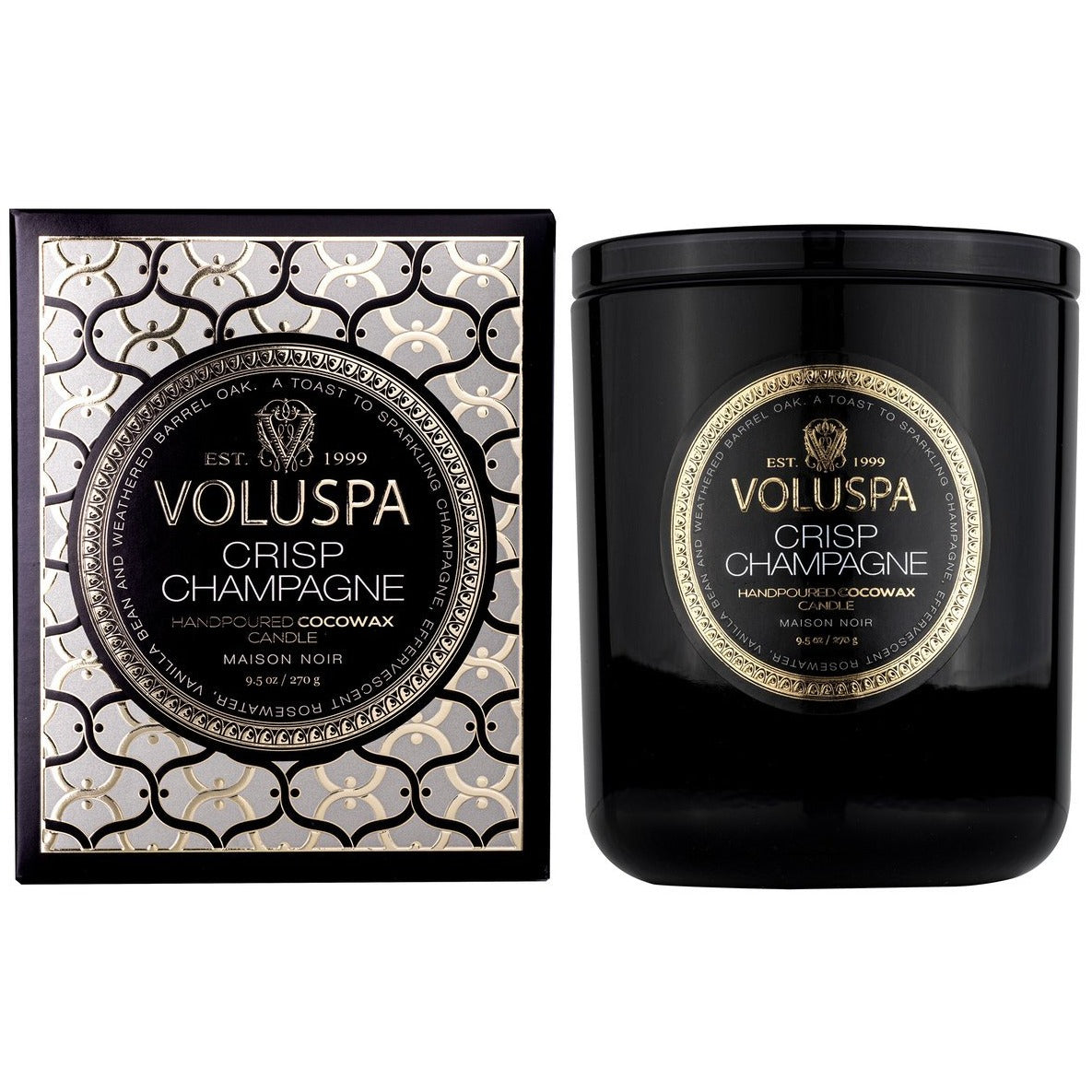 Voluspa hasĀ bottled that first sip feeling – drink in a brut tickle of chilled bubbles and toast to the aroma of vanilla, apples and peaches, all from a cool wooden cask. Perfectly capturing the moment before a bottle of champagne is uncorked, Crisp Champagne makes every day an occasion to toast.