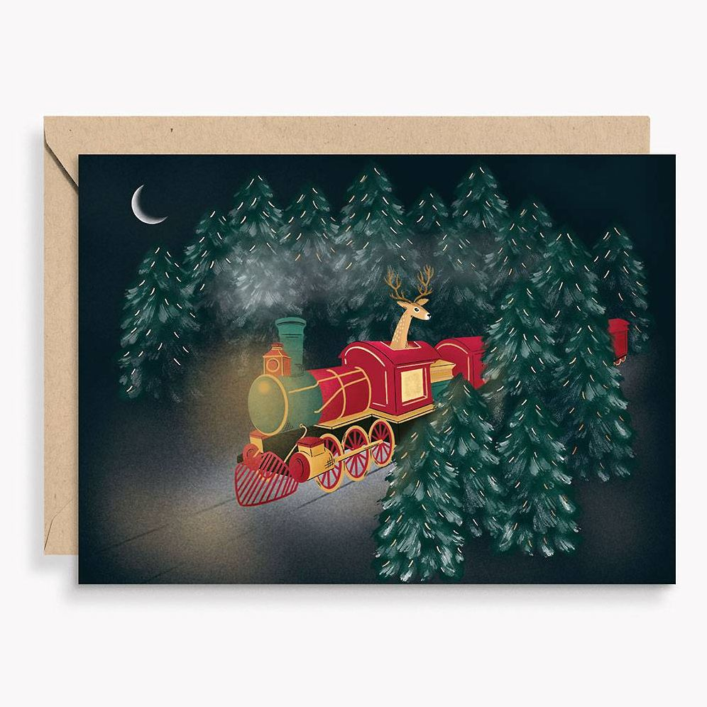 Choo Choo, it’s that time of year again! This adorable card is perfect to send love this holiday season. Inside sentiment reads, “May the magic of the holiday season fill your heart with wonder and delight.” Features foil details. Folded card. Paired with matching envelope. Designed by Paper Source.