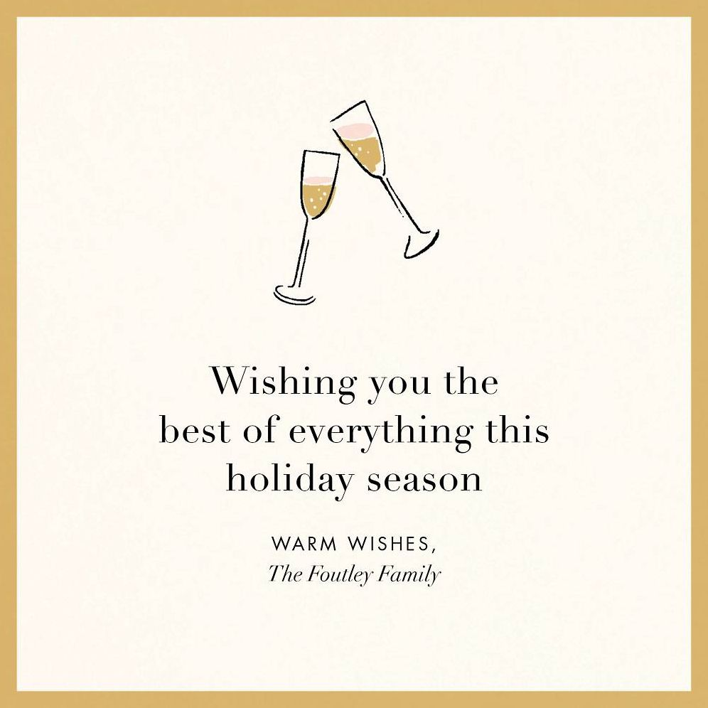 Let those you love know that you’re thinking of them with this personalized holiday card from kate spade new york by Paperless Post. This card pictures two champagne glasses cheers-ing and can be further customized with a message from you and your family. Note: Mailing square cards to your recipients will require additional postage. Printed on Mohawk ultra white 120 lb. card stock that is soft to the touch and matches our superfine white envelopes. Paper is FSC certified and made using wind power.