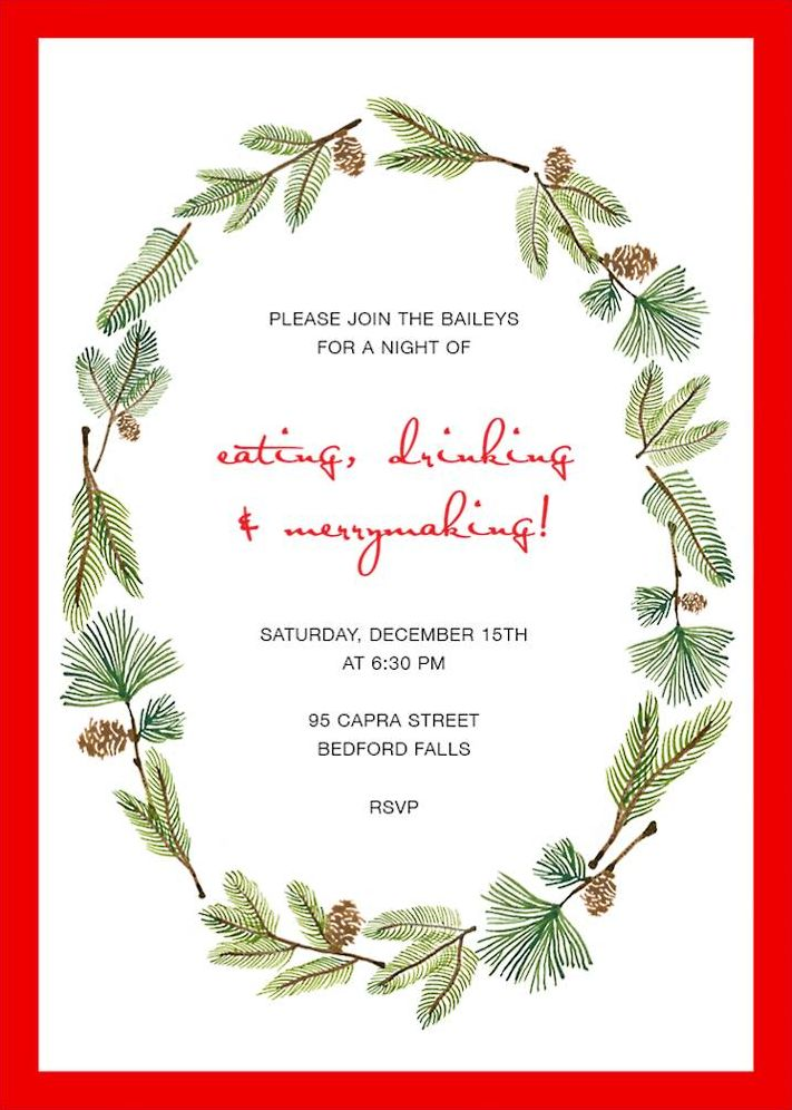 Invite your friends for an evening of chatter, eating and celebrating with this wreath bordered holiday card by Paperless Post. This card features a pine wreath with acorns and is pulled together with a bold red border to get you in the holiday spirit.