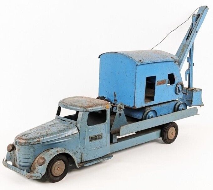 Original Structo truck and steam shovel. The truck is missing the ramps and the shovel is missing the tracks. The shade of blue is different from the truck and shovel. Both have paint loss, surface rust, and wear from play / age. The truck measures approximately 22″ long.