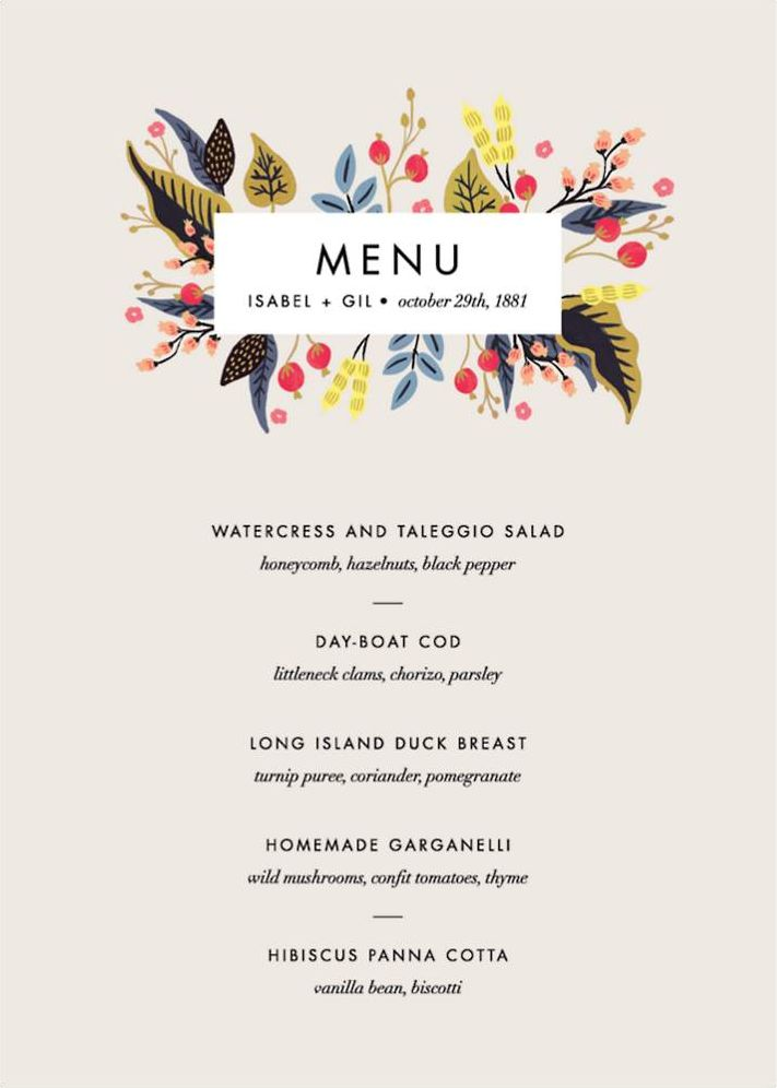 This two toned wedding menu by Rifle Paper Co. for Paperless Post is perfect to inform all celebrating your big day as to what food they will enjoy. Bordered with colorful florals with a place in the center to add all your food details. Printed on Mohawk superfine white 130 lb. card stock that is soft to the touch and matches our superfine white envelopes. Paper is FSC certified and made using wind power.