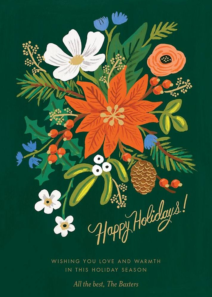 This card showcases a hand-painted evergreen and poinsettia bouquet, capturing the verdant beauty of the season with Rifle Paper Co.’s distinctive style. Printed on Mohawk 120.0 lb Superfine Ultra White. This paper is FSC certified, with 30% post consumer recycled content, and made using wind power.
