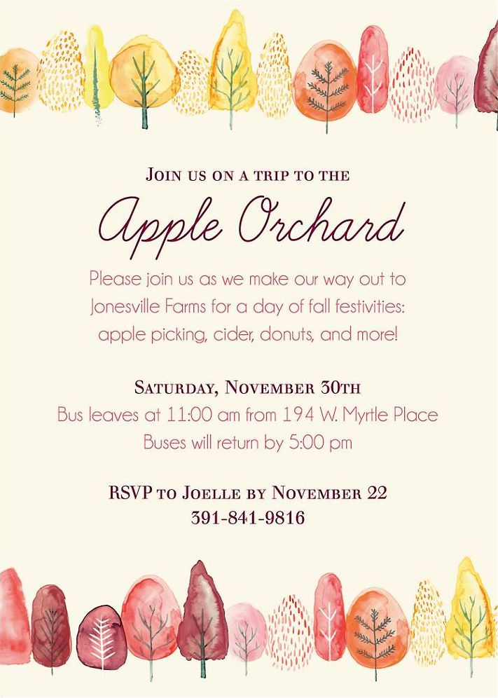 Gorgeously colored watercolor trees surround your details on this festive fall invite. Printed on Mohawk superfine white 130 lb. card stock that is soft to the touch and matches our superfine white envelopes. Paper is FSC certified and made using wind power.