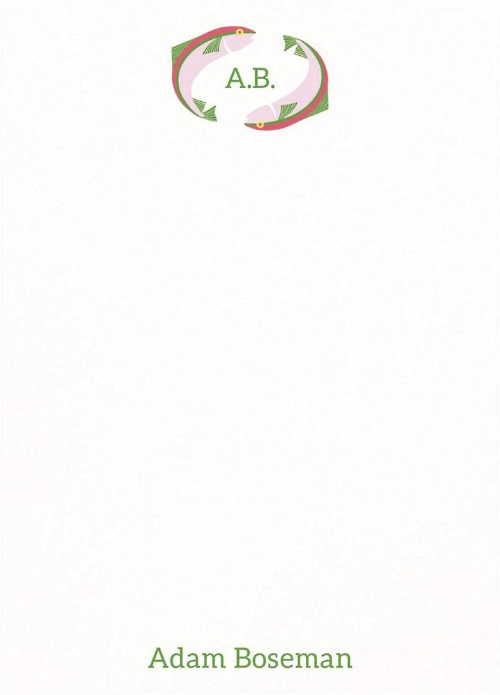 Perfect for ardent anglers, aquascape experts, and tinned fish aficionados alike, this stationery featuring two schooling fish is sure to hook the attention of your correspondents. Printed on Mohawk superfine white 130 lb. card stock that is soft to the touch and matches our superfine white envelopes. This paper is FSC certified, with 30% post consumer recycled content, and made using wind power.