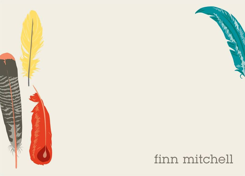 Colorful feathers create a unique stationery design that works for any occasion. A wonderful blend of sophisticated elements and playful charm. Printed on superfine white paper, which has a smooth finish and is soft to the touch. 130# cover weight paper with 30% post consumer recycled content.