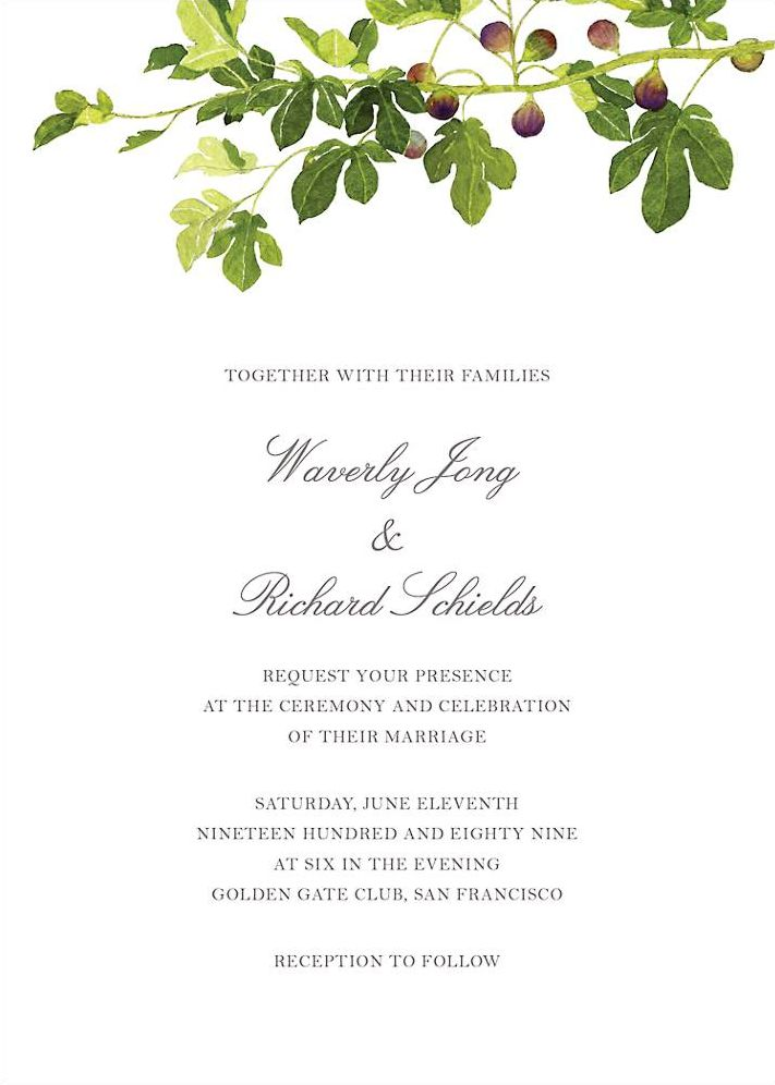 Pretty fig branches lie atop this elegant wedding invitation, part of the Fig Branches suite of wedding cards designed by Felix Doolittle for Paperless Post. Printed on Mohawk superfine white 130 lb. card stock that is soft to the touch and matches our superfine white envelopes. Paper is FSC certified and made using wind power. Corresponding Paperless Post digital design also available.