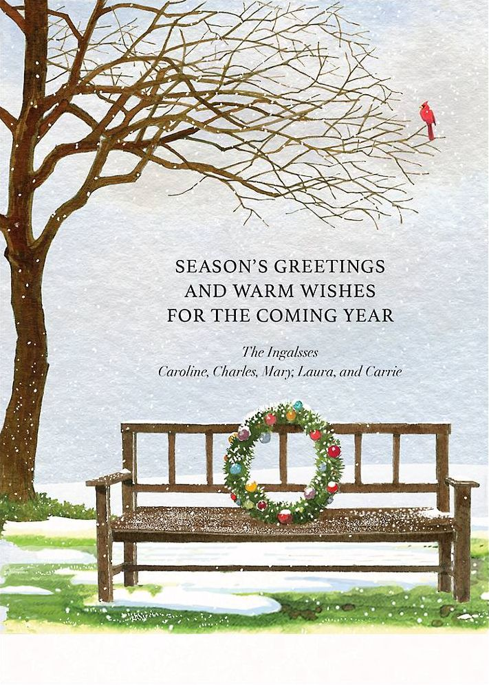 Let those you love know that you’re thinking of them with this personalized holiday card from Felix Doolittle by Paperless Post. This card pictures a peaceful bench and can be further customized with a message from you and your family. Printed on Mohawk ultra white 120 lb. card stock that is soft to the touch and matches our superfine white envelopes. Paper is FSC certified and made using wind power.