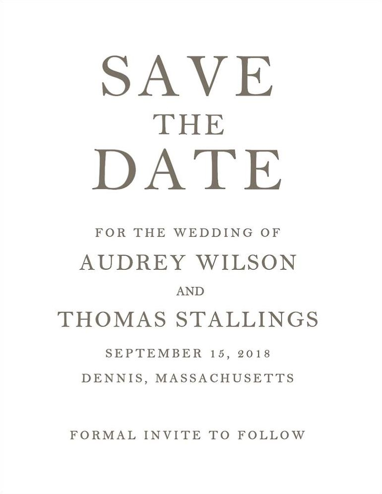 A sophisticated font presents your names boldly typed on these Save The Date Cards. They’re sure to get your friends and family excited for your big day! This design features Audrey & Thomas as shown, but will be customized featuring the names of your choice. Printed on Mohawk superfine white 130 lb. card stock that is soft to the touch and matches our superfine white envelopes. Paper is FSC certified and made using wind power.