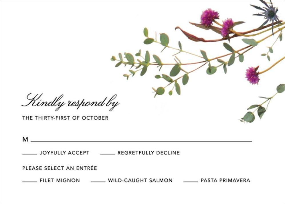 Floral arrangements are what make weddings even more magical than they already are in essence. Gather all your loved ones for your big day with this floral wedding response card by Paperless Post. Printed on Mohawk superfine white 130 lb. card stock that is soft to the touch and matches our superfine white envelopes. Paper is FSC certified and made using wind power.