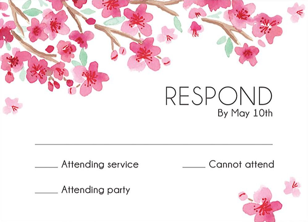Complete your invitation suite with a coordinating response card – the traditional way for guests to let you know if they will be attending your event. Design features lovely pink blossoms along the top with responses below. Your card can be customized to accommodate your specific response options.