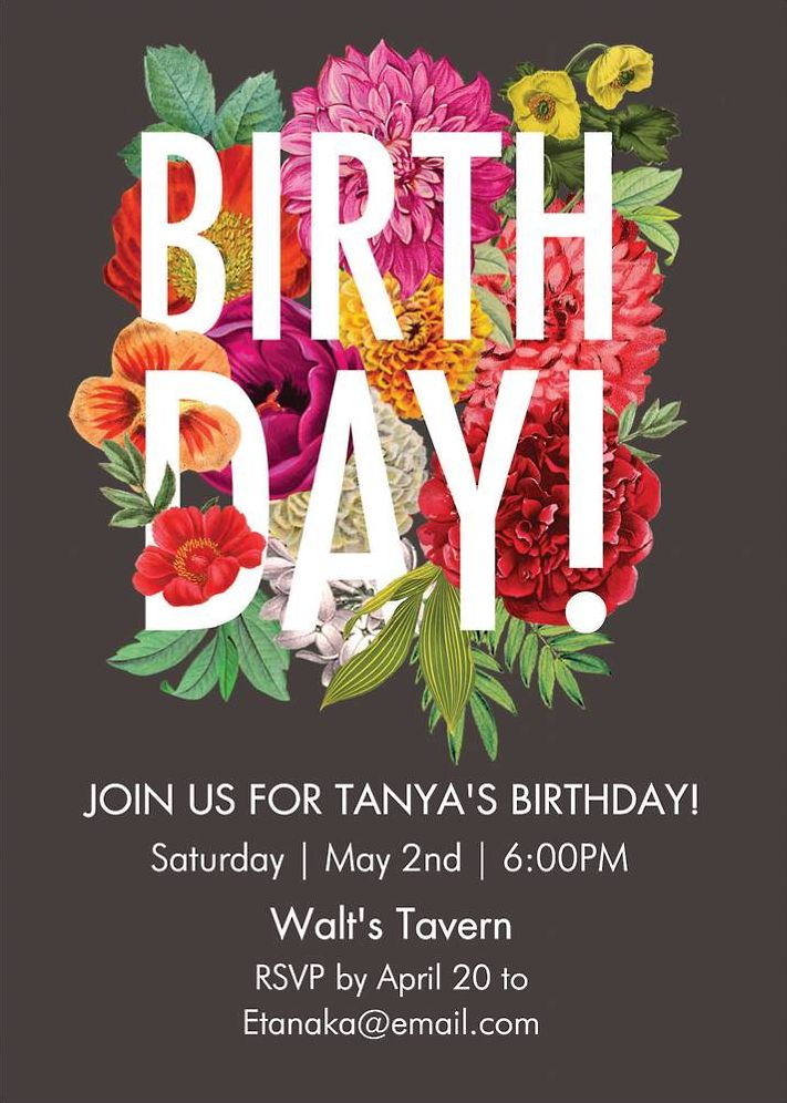 A colorful bouquet blossoms above the birthday girl’s party information on this sweet floral birthday invitation. Vibrant colors pair with charcoal background to create a charming design. Printed on white 130 lb cover paper with a tactile vellum finish. 100% post-consumer waste, FSC certified.