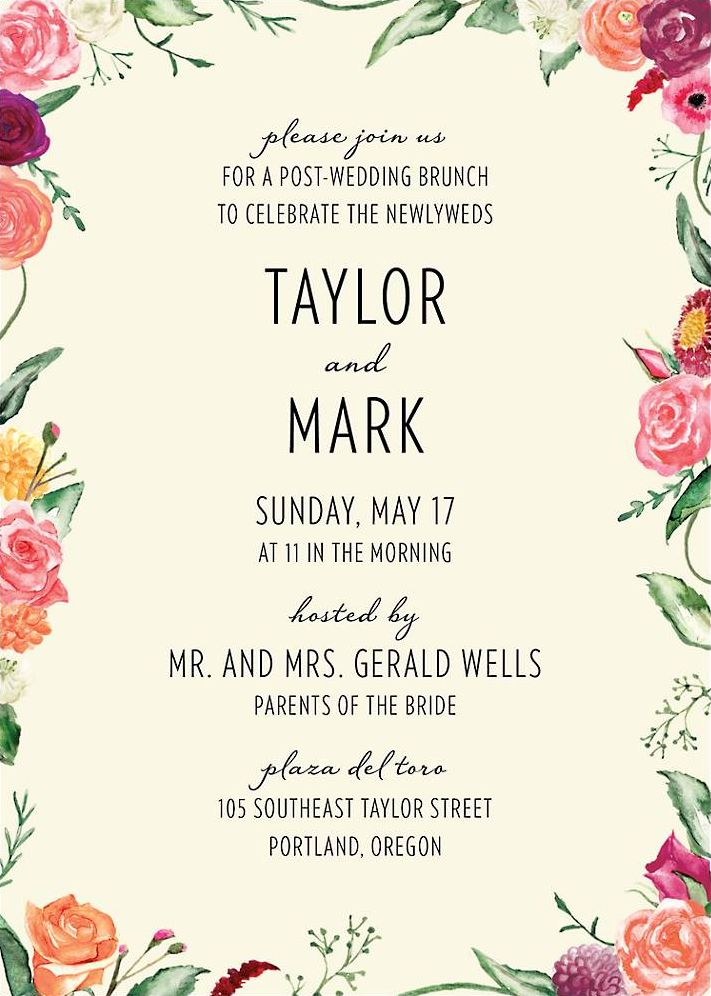A panoply of colorful flowers frames your details on this pretty wedding brunch invitation, part of the Floral Wreath suite of wedding cards from the designers at Paper Source. Printed on Mohawk superfine soft white 130 lb. card stock that is soft to the touch and matches our superfine soft white envelopes. Paper is FSC certified and made using wind power.