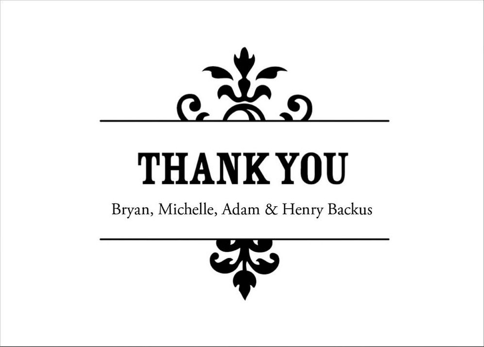 A lovely flourish design is an elegant frame around a message of thanks along with your family’ s names. The 4 Bar folded format offers the perfect amount of room to write on the inside.