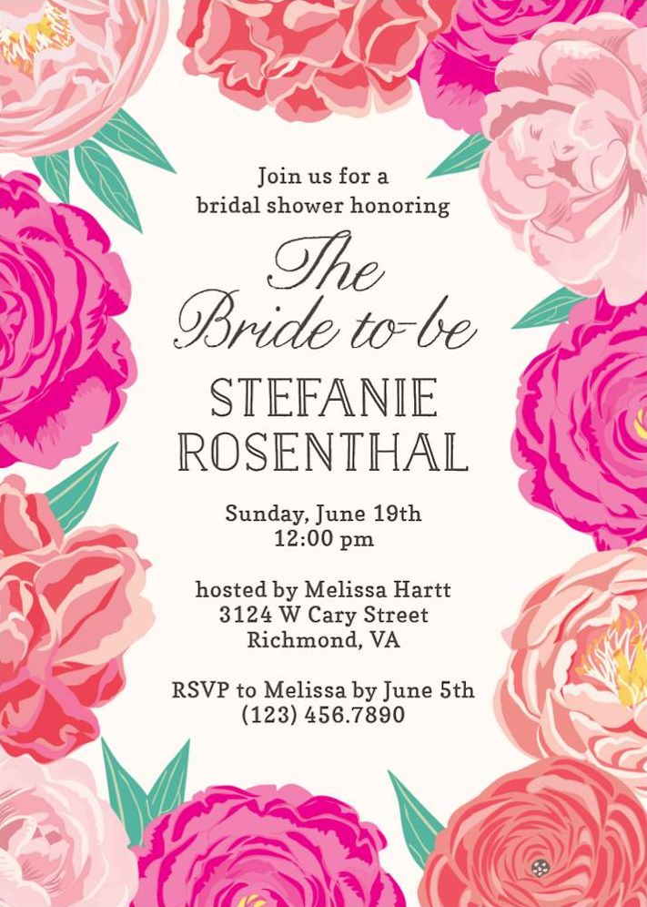 The vivid shades of pink in the rose border illuminate this bridal shower invitation, creating a vivacious spring or summertime feel. Printed on white 130 lb cover paper with a tactile vellum finish. 100% post-consumer waste, FSC certified.
