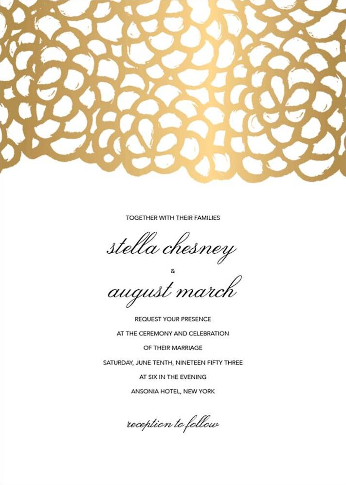 Set the tone of your upcoming wedding festivities with this foil Oscar de la Renta for Paperless Post wedding invitation. This wedding invitation features an intricate gardenia design, with fine detail of ornamentation and elegant swirls. Perfect for a classy, elegant and enchanting wedding theme. Printed on superfine white paper, which has a smooth finish and is soft to the touch. 130# cover weight paper with 30% post consumer recycled content.