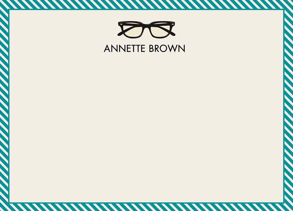 A single pair of eyeglasses add loads of charm to this fabulous stationery. Striped border and simple font complete the look. Printed on superfine white paper, which has a smooth finish and is soft to the touch. 130# cover weight paper with 30% post consumer recycled content.