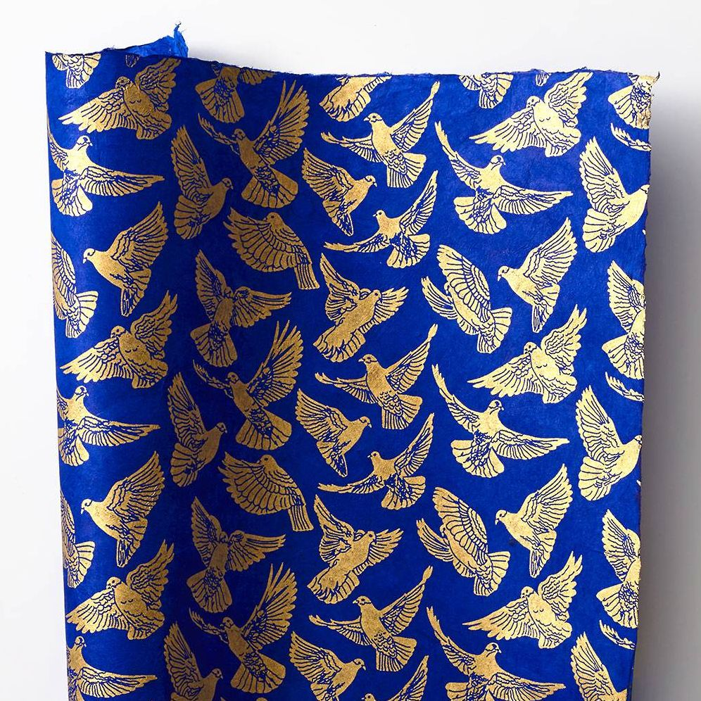 Create a unique wrap or lovely craft project featuring this beautiful handmade paper with a gold foil bird design and a lovely sapphire paper. Made from the renewable fibers of the Lokta plant, this fine paper is also a green choice for your projects!