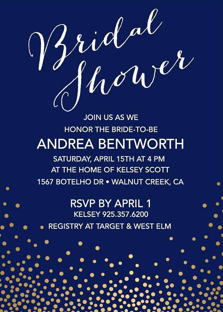 The elegant white script on this bridal shower invite sets a dreamy tone for your upcoming celebration. Delicate gold “bubbles” adorn the bottom border of this suite, with all the pertinent information popping off the card! Printed on white 130 lb cover paper with a tactile vellum finish. 100% post-consumer waste, FSC certified.