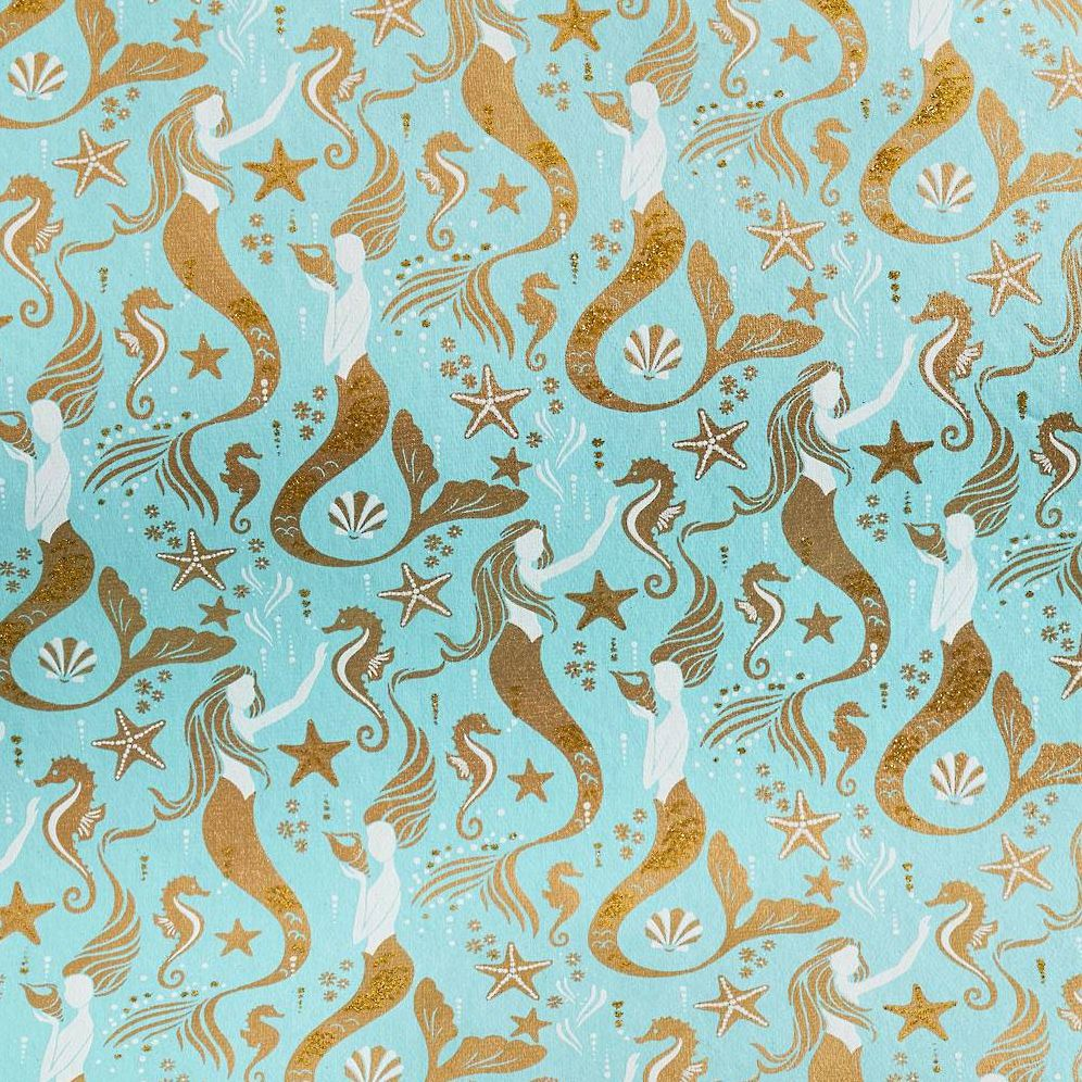 Add sparkle and shimmer to your crafting projects with this enchanting paper. Handmade paper is light blue with glittering gold and white mermaids, seashells, seahorses, and starfish. Would be amazing as gift wrap, or perfect for home decor and DIY projects.