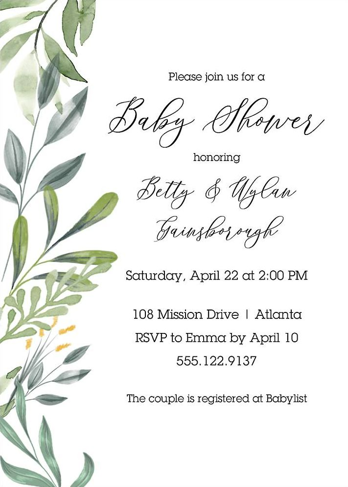 Soft, painterly watercolor greenery borders your day-of details on this baby shower invitation, designed in-house at Paper Source.