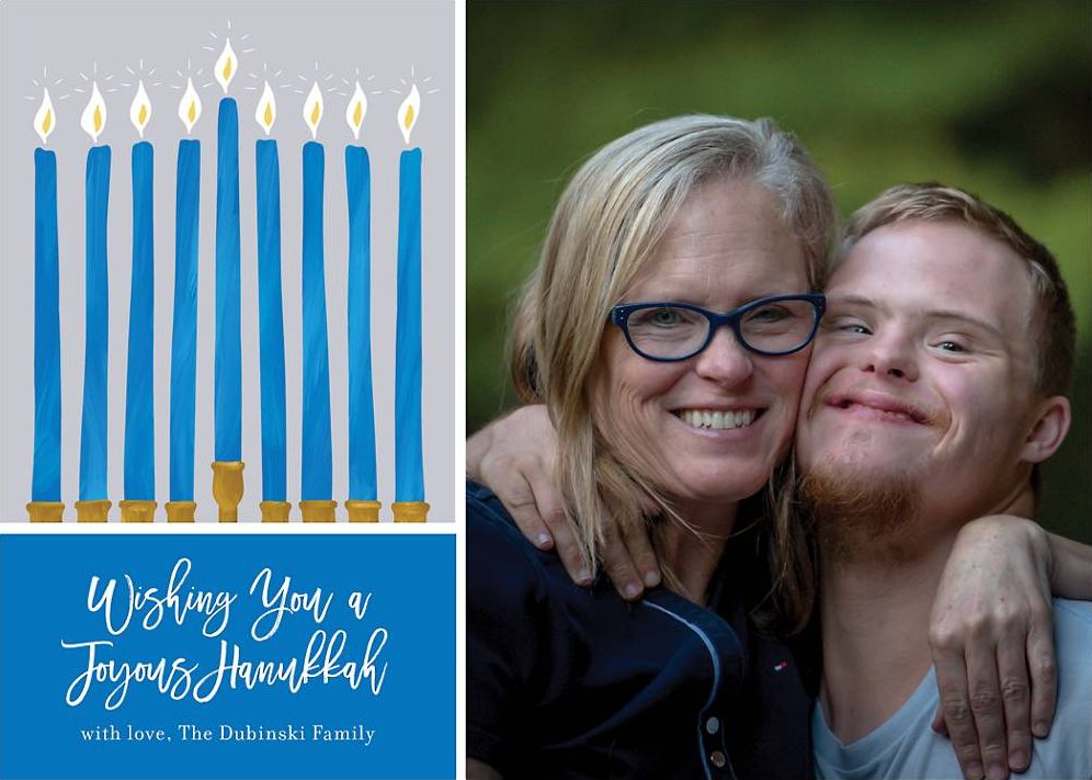 A beautiful painterly menorah is printed alongside your favorite photo on the front of this holiday card, wishing your friends and family love and light this Hanukkah season. Designed by Paper Source.