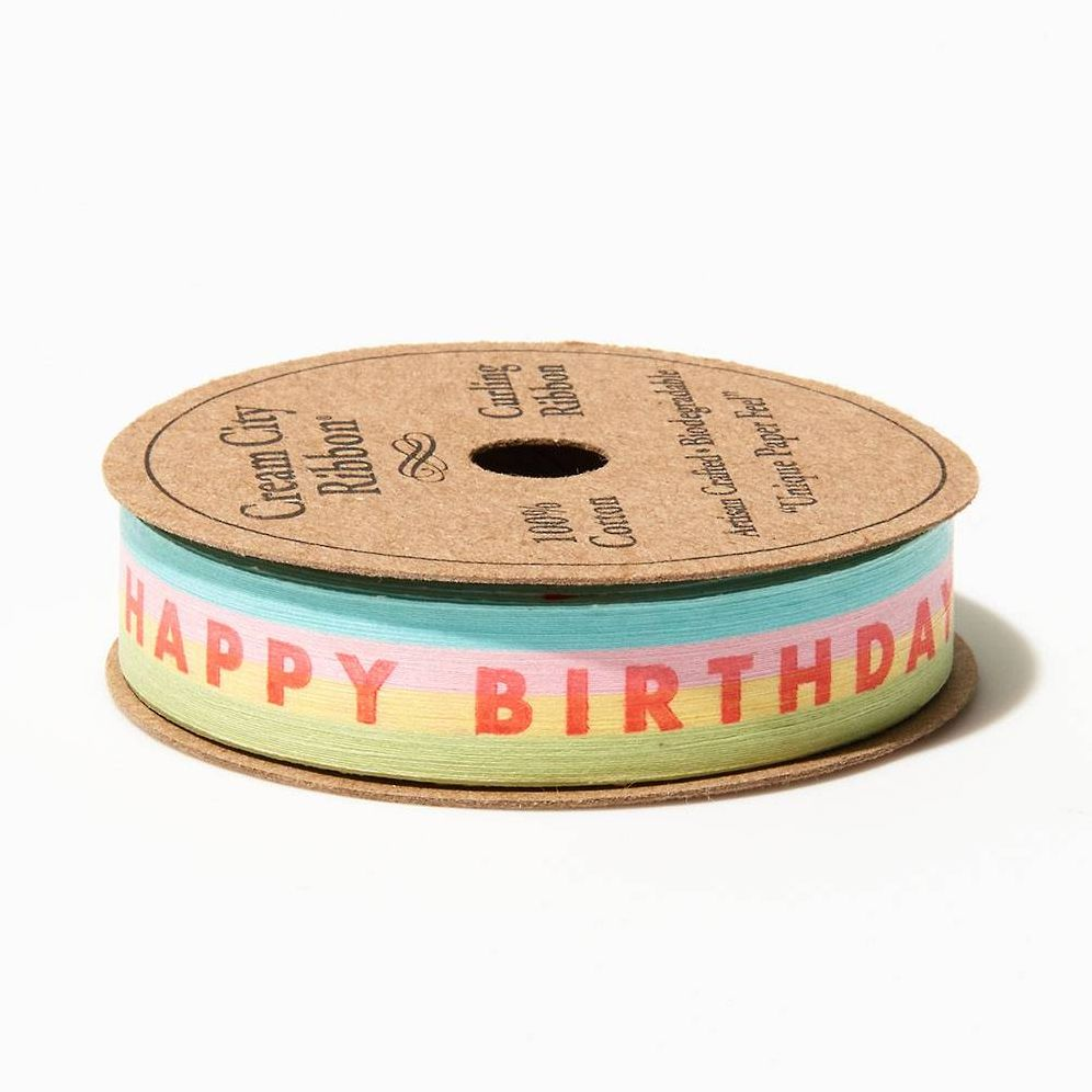 This colorful ribbon features Happy Birthday scripted onto the ribbon. It is the perfect finishing touch for gifts or crafting projects. By Cream City Ribbon 100% Cotton Yarn Biodegradable