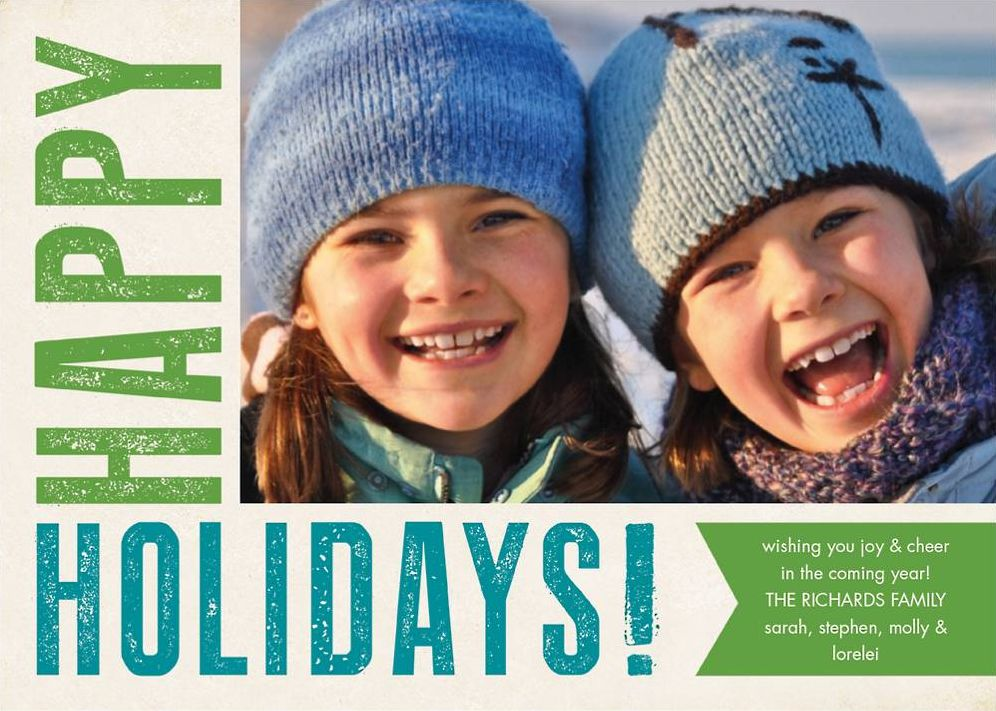 Wish all your loved ones Happy Holidays with this festive holiday card. Blocked lettering and bold banner ribbon frame your wonderful photo for a delightfully, modern design. Printed on Mohawk ultra white 120 lb. card stock that is soft to the touch and matches our superfine white envelopes. Paper is FSC certified and made using wind power.