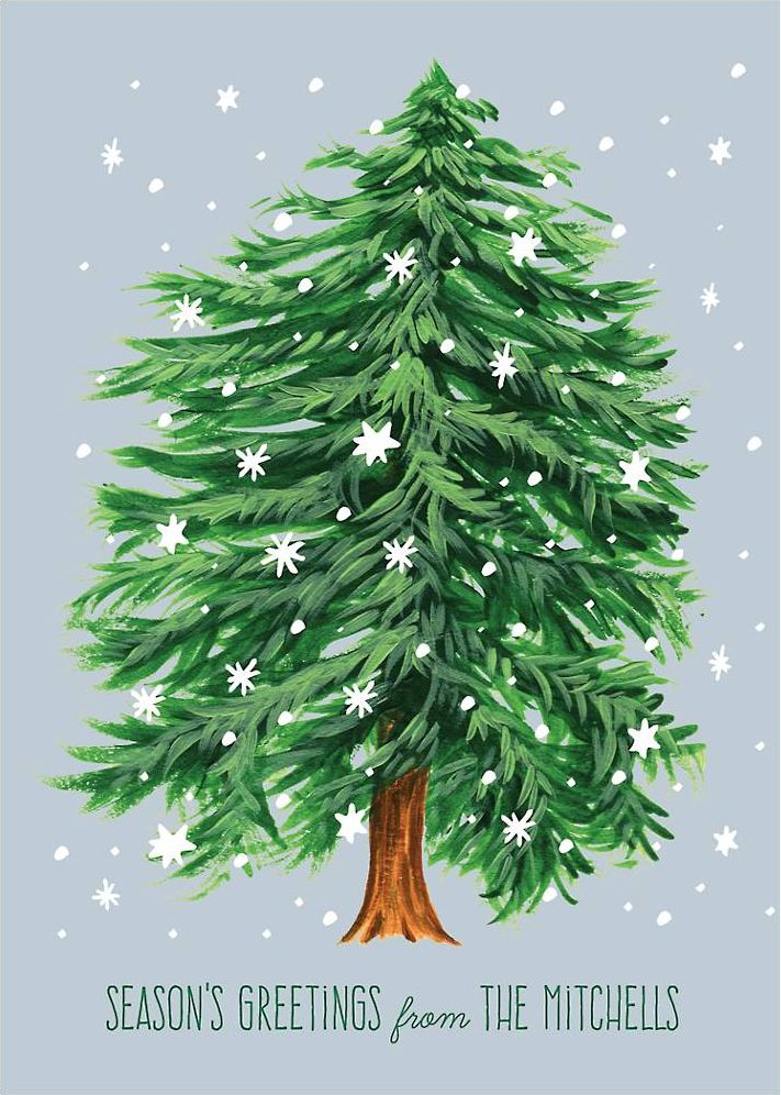 A happy tree stands tall on a snowy, perhaps blustery, winter evening in this holiday scene. Send a warm and loving message to friends and family with one of our unique custom holiday cards, featuring artwork created by our designers in Chicago. Printed on Mohawk ultra white 120 lb. card stock that is soft to […]
