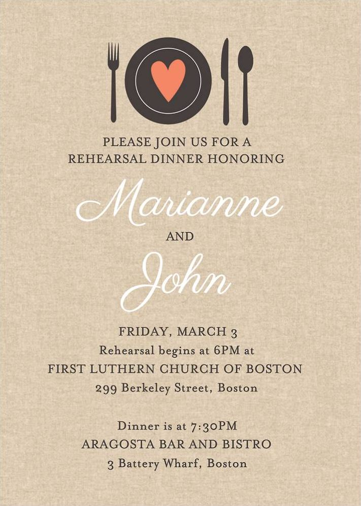 Share their love with this sweet and contemporary rehearsal dinner invitation that features a charming graphic place setting. Printed on white 130 lb cover paper with a tactile vellum finish. 100% post-consumer waste, FSC certified.
