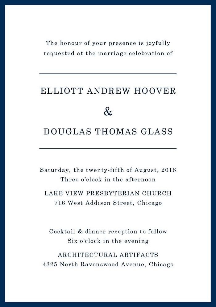This wedding design offers a strong, sophisticated feel with a simple border and clean typography. Perfect for a classic affair in a museum, library or other elegant setting.