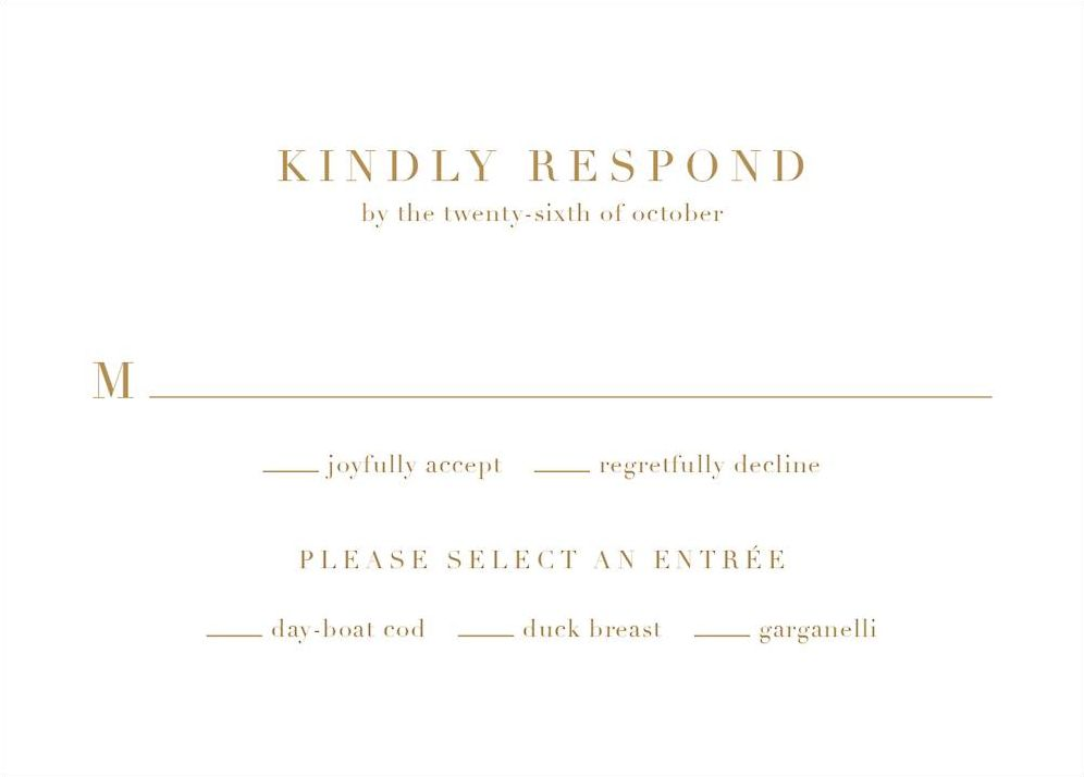 A simple RSVP, the Herrgarde Response Card is a lovely complement to the rest of the Herrgarde wedding suite, designed by Paperless Post. Printed on Mohawk superfine white 130 lb. card stock that is soft to the touch and matches our superfine white envelopes. Paper is FSC certified and made using wind power.