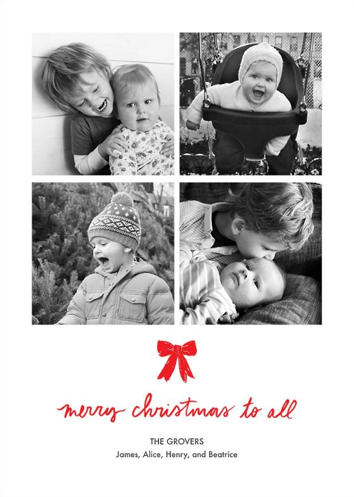 This personalized holiday photo card by Linda and Harriett for Paperless Post features a place to add up to four photos. It reads “Merry Christmas to All” and features a sweet little Christmas bow.