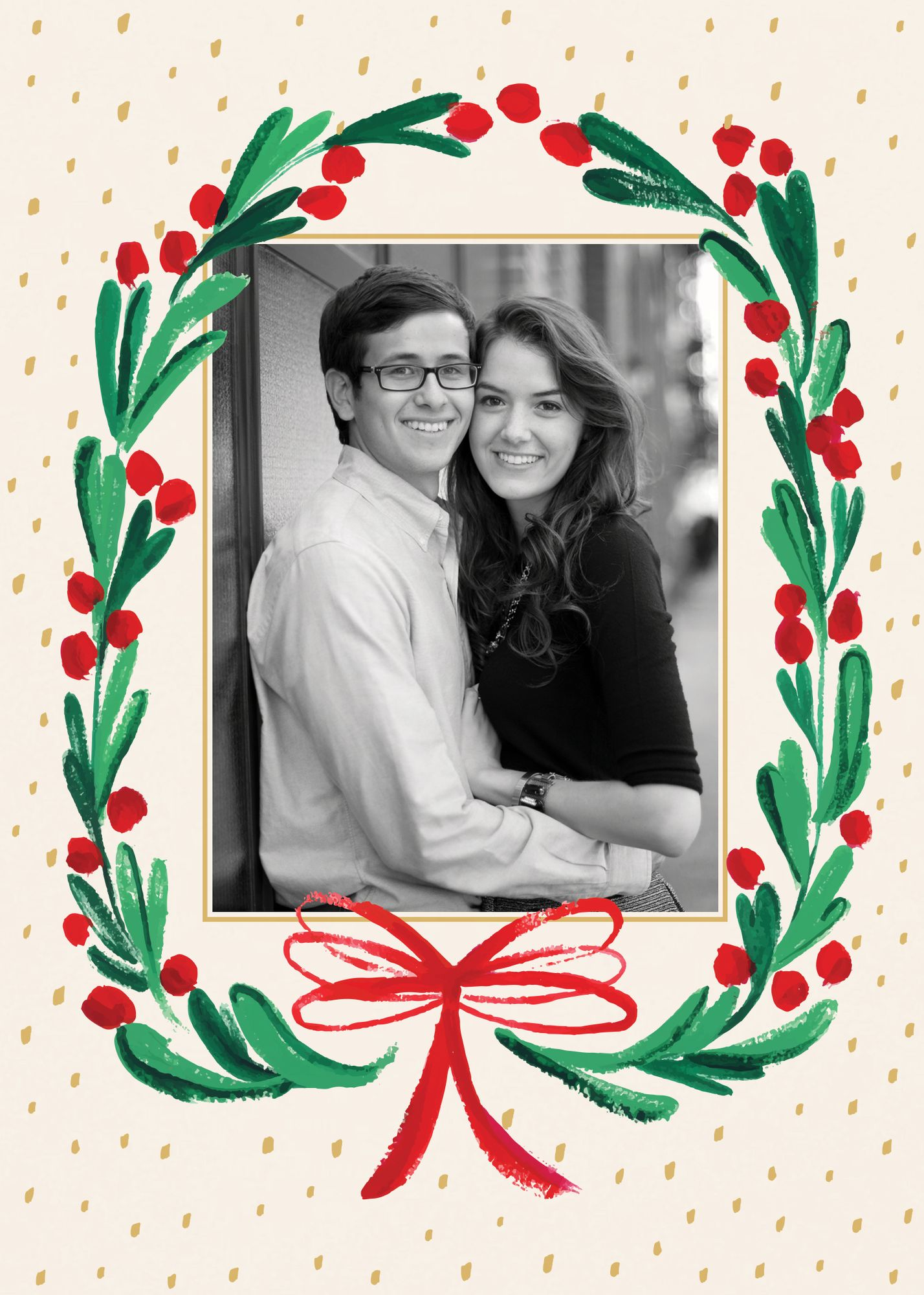 Sweet holly berries on greenery frame your memories in this design from Mr. Boddington’s Studio for Paperless Post. Printed on Mohawk ultra white, 120 lb. card stock that is soft to the touch and matches our superfine white envelopes. Paper is FSC certified and made using wind power.