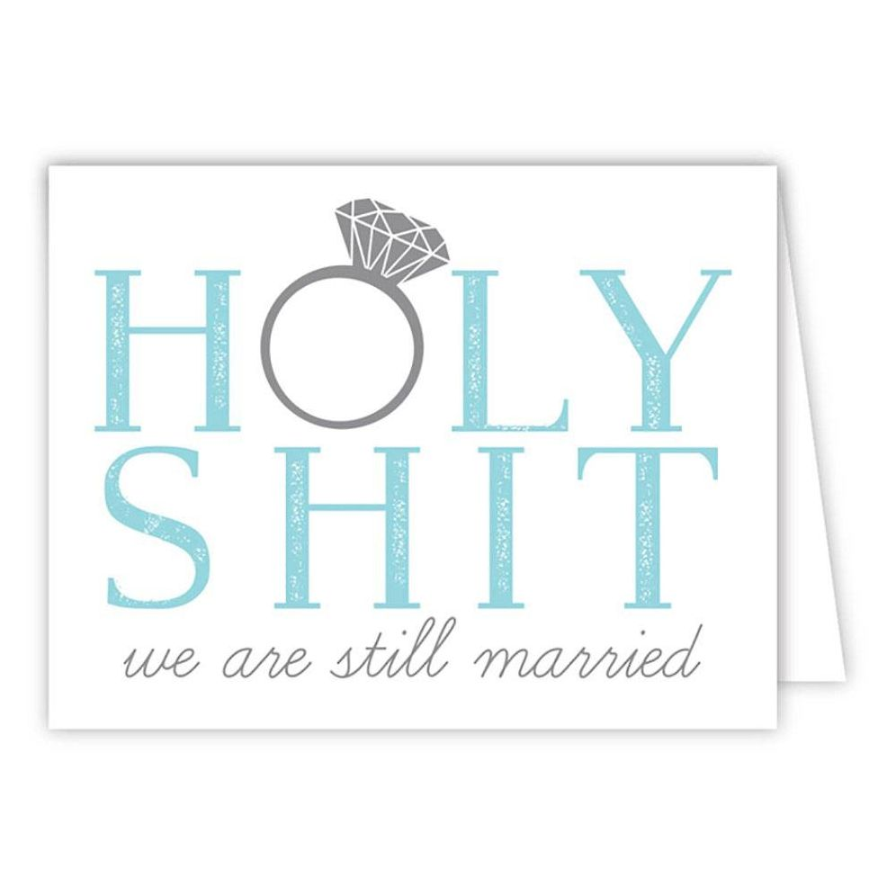 A funny card to share with your significant other on your anniversary! This greeting card reads “Holy Shit we are still married”. “O” in “Holy” is a ring with silver glitter detailing. Folded card. Blank inside. Accompanied by baby blue envelope. Designed by Rosanne Beck Collections.