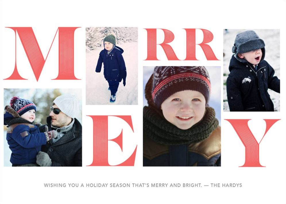 Wish those you love the merriest holiday season yet with this hopscotch holiday photo card by Paperless Post. Personalize this card by adding photos of you and the kiddos! The bold letters spell out “Merry” to get your loved ones in the holiday spirit!