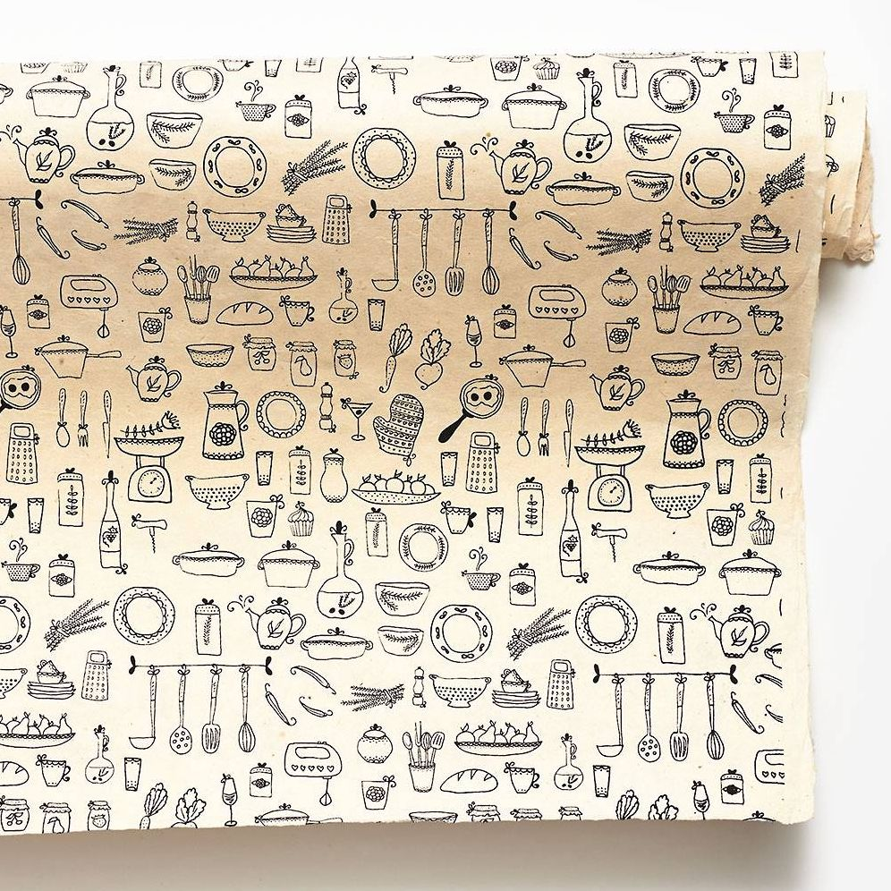 Create a unique wrap or lovely craft project featuring this paper with adorable hand drawn kitchen tools, gadgets, and gizmos. Made from the renewable fibers of the Lokta plant, this fine paper is also a green choice for your projects!