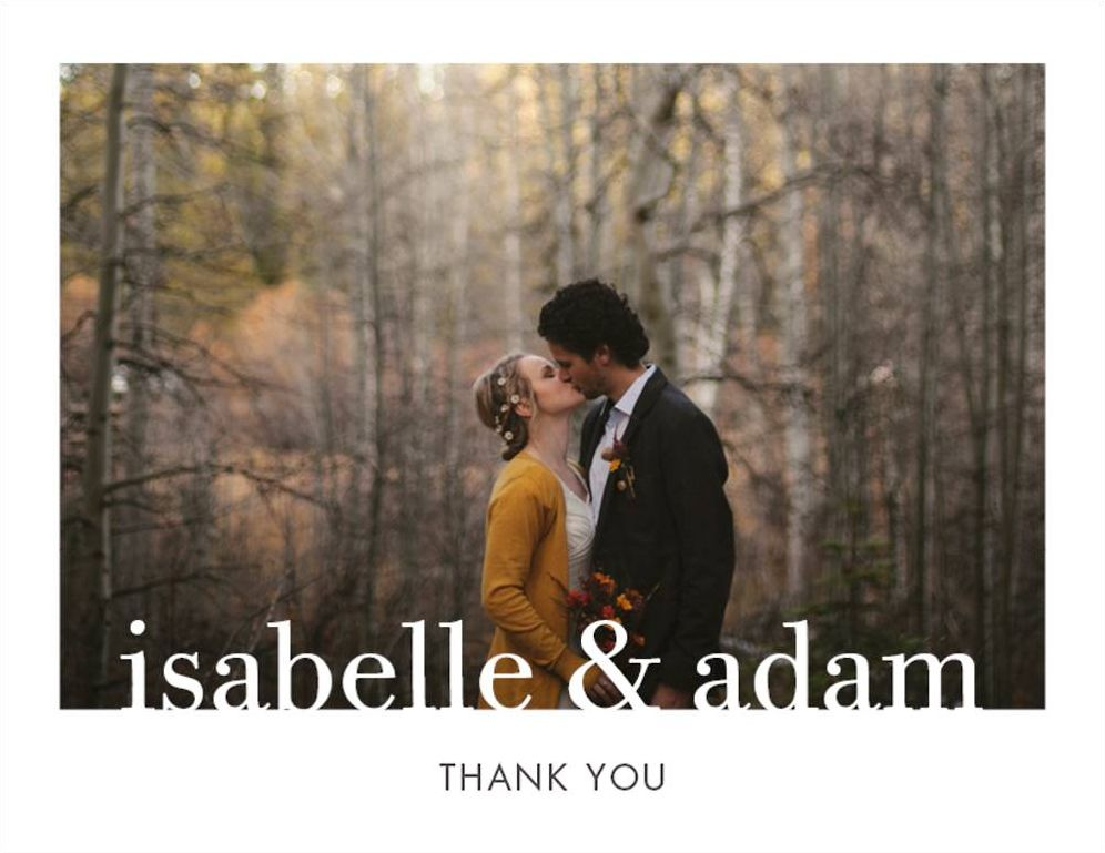 Simple fonts on this thank you note create a delightful design for your photo and message. The perfect card to say thank you after a wedding or any other event. Printed on white 130 lb cover paper with a tactile vellum finish. 100% post-consumer waste, FSC certified.