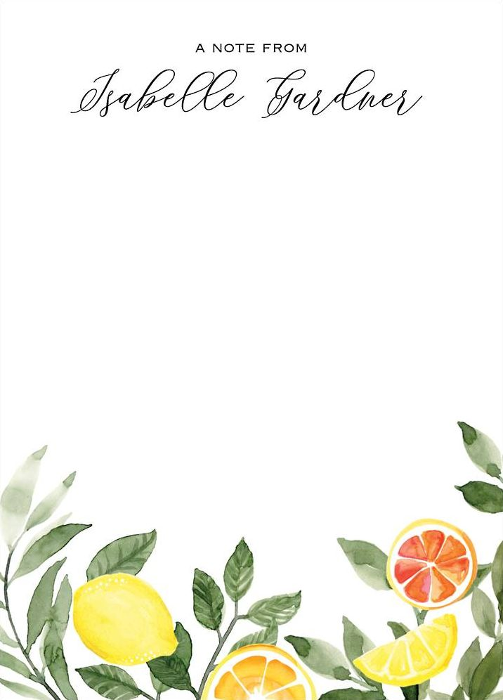 The Lemon Leaves Stationery is a citrusy delight, personalizable with your name. Designed right here at Paper Source. Printed on Mohawk superfine white 130 lb. card stock that is soft to the touch and matches our superfine white envelopes. Paper is FSC certified and made using wind power.