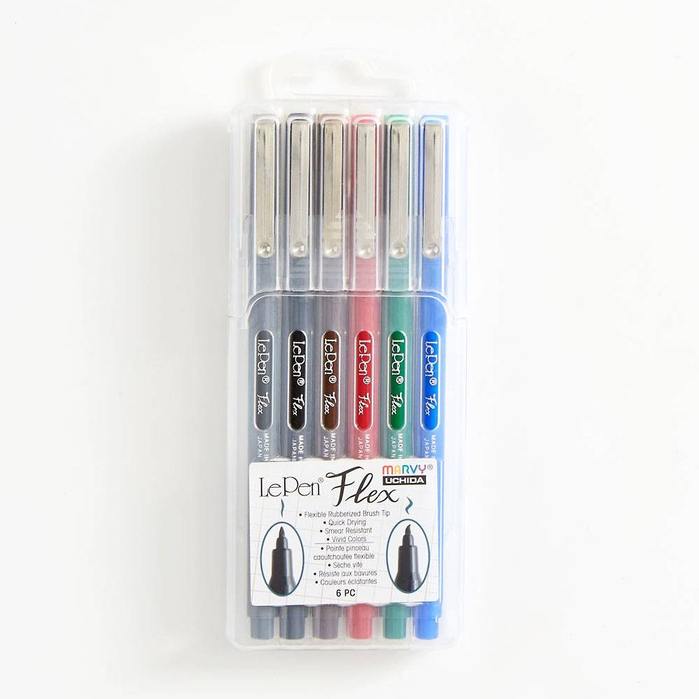 The Le Pen Flex set comes with a durable, flexible rubberized brush tip that is great for hand lettering, journals, planners and much more. This set of 6 pens comes with a grey, black, brown, red, green and blue pen.