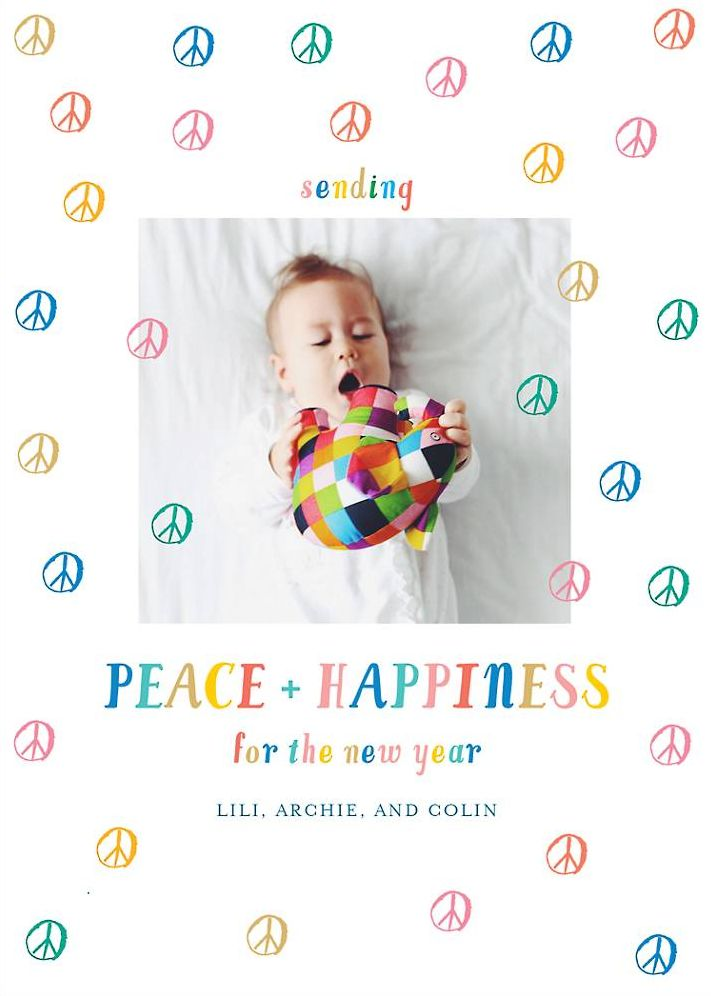 Multicolored peace signs pepper the face of this vibrant New Year photo card from the designers at Mr. Boddington’s Studio for Paperless Post.